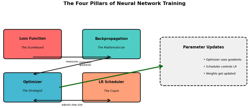 Think of training a neural network as navigating through a vast, multidimensional landscape where you’re searching for the lowest valley (minimum loss). Four distinct mechanisms work together: